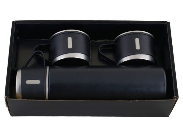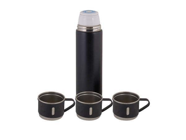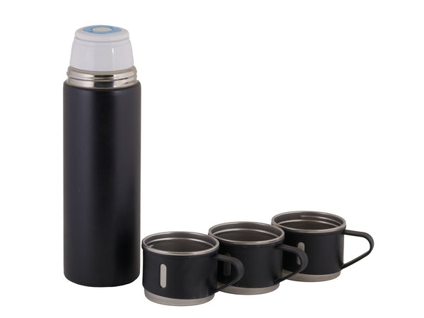 500ml Flask has double-wall stainless steel insulation, keeping beverages hot and cold. With a Hermetic vacuum seal, ensuring perfect waterproofing and an odourless inner lining. Includes 3 x 120ml matching mini mugs, perfect for sharing coffee, tea or a cold beverage, that also fit on the flask as a lid.