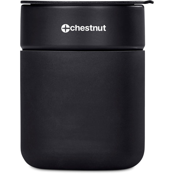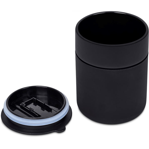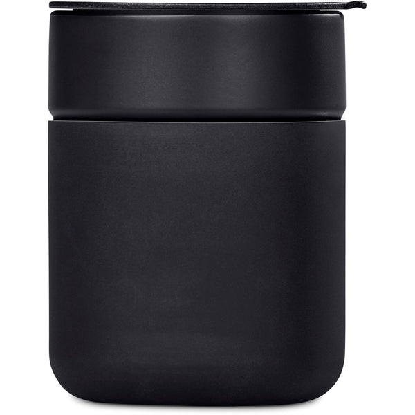 Designed to fit comfortably in your hand, this ceramic travel coffee tumbler features a silicone sleeve to protect your hand from the heat of the liquid inside.