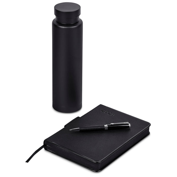 Make an impressive start to the new year with this elegant gift set from Alex Varga.Features a diary with black page edge finishing and a steel frame PU cover, a premium ball pen, and an 800ml stainless steel vacuum water bottle, which will keep liquids cold or hot for hours. They’re combined in a solid, 2-piece presentation box, with a velvet-finish inner. This gift set consists of: