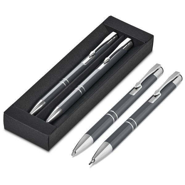 Ball pen and mechanical pencil with shiny anodised, coloured barrels and shiny chrome accents, packaged together in a black presentation box. The box is made from kraft paperboard and measures 17.2 ( l ) x 5.2 ( w ) x 2.2 ( h ) cm.